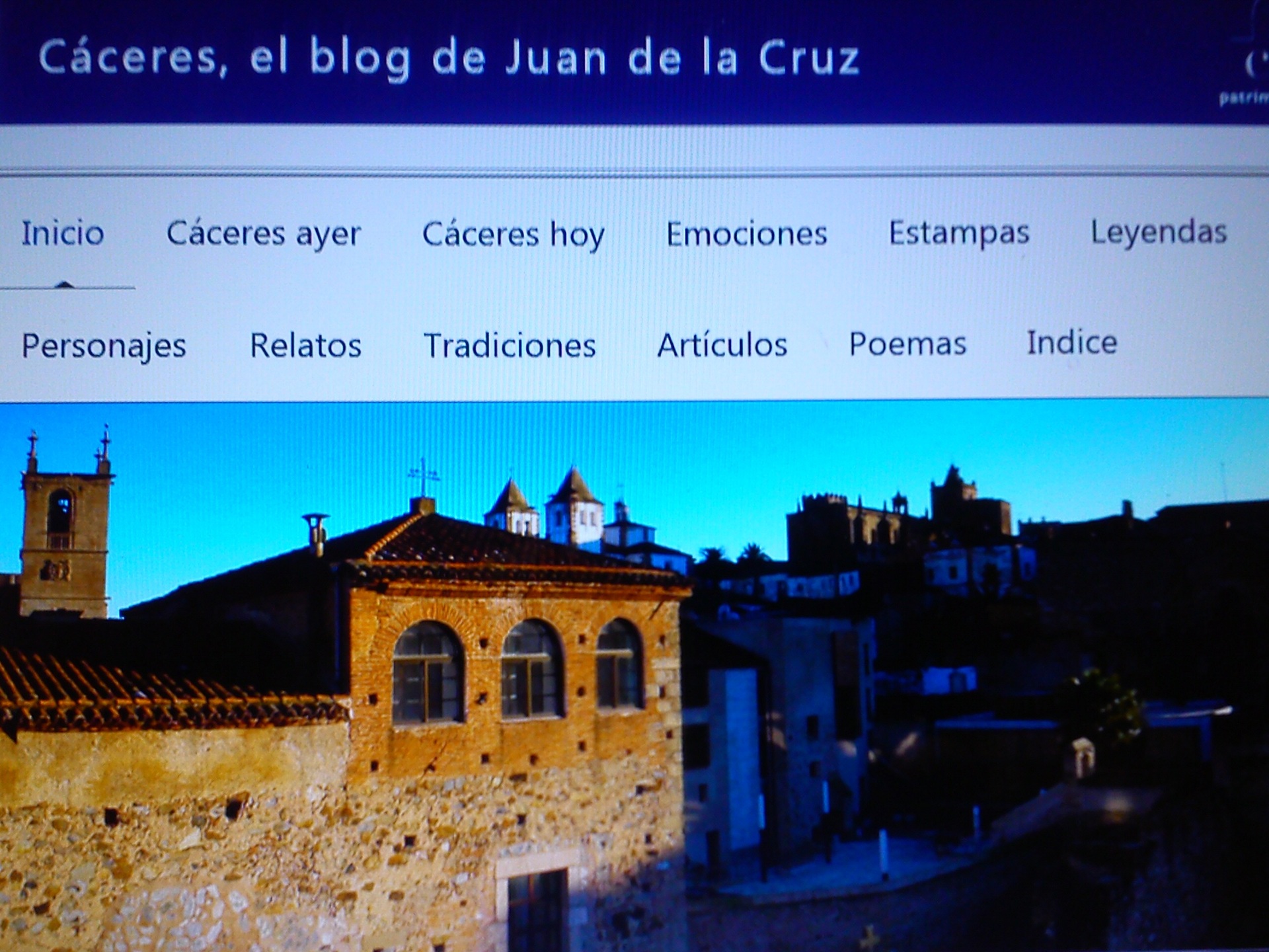 Portada del blog Caceres de Juan de la CruzSe trata de un Blog con diversas Secciones como Cáceres Ayer, Estampas, Personajes, Artículos, Poemas, y un largo etcétera como una historia de Sueños, de Historias, de Curiosidades, de Vivencias, de Recuerdos, de Fotografías, de Sensaciones, de Emociones. de Indagaciones y Trasiegos.