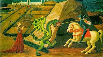 Este caballero llamado Jorge, se enfrentó al dragón tan pronto como este apareció. Libraron una gran batalla hasta que el caballero le incrustó una gran lanza al dragón en el pecho. De la sangre que derramó el dragón nació un hermoso rosal que Jorge entregó a la princesa después de haber ganado la batalla.