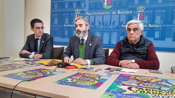 El concejal de Ferias y Fiestas, Francisco Javier Gutiérrez, ha presentado el programa del Carnaval de Badajoz 2023 acompañado del director territorial de Extremadura y Sur de Ibercaja, Fernando Planelles, y del representante de Distribuciones Carballo, José Carballo, en nombre del patrocinador oficial y del colaborador en esta Fiesta de Interés Internacional que contempla para este jueves, día 2, a las 20,00 horas en el López de Ayala el estreno del documental 'Badajoz es Carnaval, el Carnaval de la calle' dirigido y producido por Celia Rojas.
