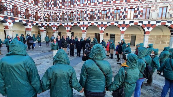 La Asociación Española Contra el Cáncer (AECC) ha celebrado este viernes, día 3, en la Plaza Alta de la ciudad de Badajoz el Día Mundial del Cáncer, que se conmemora el sábado día 4, con un lazo humano verde y un toque de campanas en la torre de Espantaperros a cargo de tres personas enfermas de cáncer y en colaboración con la Asociación Amigos de Badajoz.