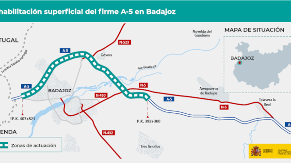 El Ministerio de Transportes, Movilidad y Agenda Urbana (Mitma) ha formalizado por 14,3 millones de euros (IVA incluido) el contrato de obras para la rehabilitación del firme de la autovía del suroeste A-5, entre los kilómetros 392,300 y 407,821, correspondiente al tramo entre Badajoz Este y Badajoz Oeste, en la provincia de Badajoz.