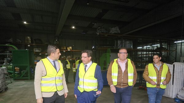 El director ejecutivo de Movilex, Luis García Torremocha, ha mostrado al consejero el proceso completo de reciclaje, gestión y producto final que se realiza desde la empresa afincada en Lobón.