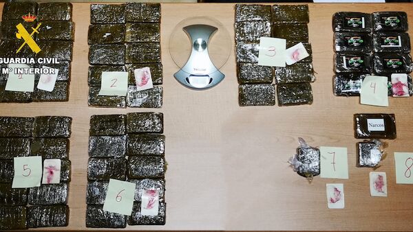 Durante la inspección de esta finca, los agentes hallaron oculto un saco de plástico que contenía seis paquetes de aproximadamente 1 kilo de hachís, en total seis kilos de esta sustancia que motivaron la detención inmediata de su propietario y que llevaron a realizar una posterior diligencia de entrada y registro en su domicilio, una vivienda situada en la localidad de Hervás, donde fueron aprehendidos otros 210 gramos de hachís y una báscula electrónica de precisión.