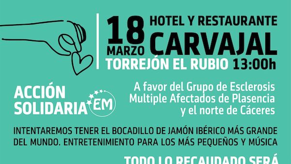 Un evento solidario donde se intentará realizar el bocadillo de jamón ibérico más grande del mundo recaudará fondos para la lucha contra la Esclerosis Múltiple este próximo sábado, 18 de marzo, en Torrejón El Rubio (Cáceres).