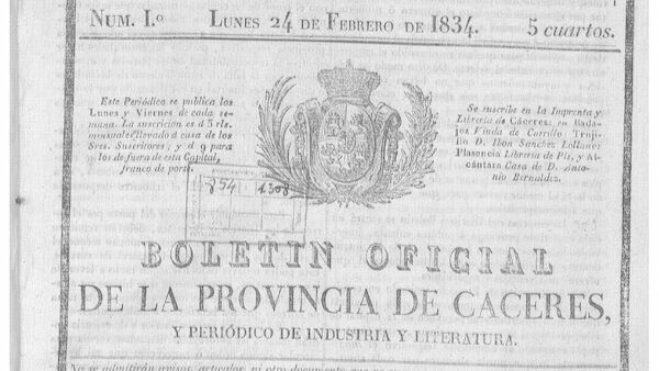 Fruto de esa normativa nace el Boletín Oficial de la Provincia (BOP)de Cáceres, cuyo primer ejemplar - o al menos el más antiguo conservado- data del 24 de febrero de 1834. Su periodicidad inicial fue de dos días por semana, publicándose los martes y viernes.