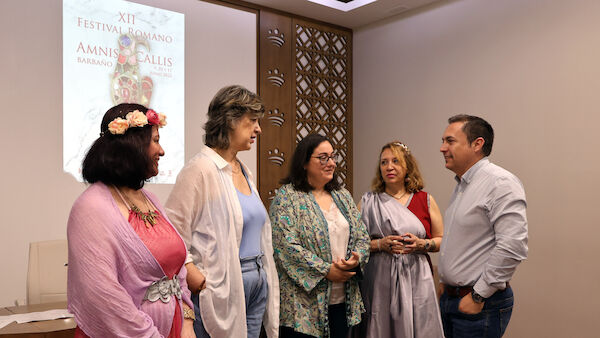 La diputada provincial en funciones, María Dolores Méndez; el alcalde en funciones de Barbaño, Sergio Tena, y la directora de la obra, María del Mar Lozano, han presentado el XII Festival Romano 'Amnis Callis' en la Diputación de Badajoz, acompañados de dos figurantes ataviadas de romanas.