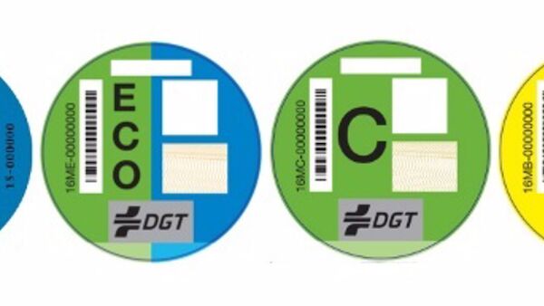 Distintivos medioambientales de la Dirección General de Tráfico (DGT) que clasifican los vehículos según su eficiencia energética.