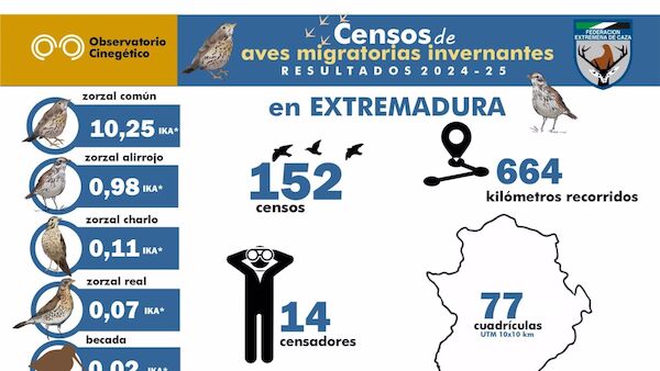 De hecho, gracias a esta labor voluntaria, se han podido registrar datos de abundancia de especies como el zorzal común, zorzal alirrojo, zorzal charlo, zorzal real y becada. Estos datos son "clave" para conocer la evolución de las poblaciones y ayudar a una mejor gestión de los recursos cinegéticos, según informa en una nota de prensa la Federación Extremeña de Caza (Fedexcaza).
