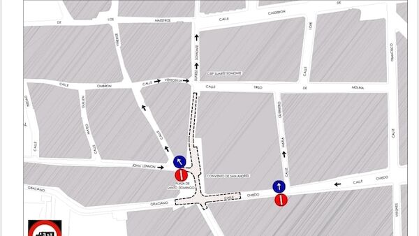 A su vez, el acceso por calle Oviedo estará cortado, debiendo llegar a ella desde calle Calderón de la Barca y calle Pizarro. Se prohíbe el acceso a este itinerario a los vehículos pesados, de más de 3,5 toneladas, y autobuses.