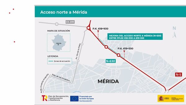 Asimismo, se incluye el resto de obras complementarias de las anteriores a desarrollar en el tramo intermedio de la N-630 a su paso por el núcleo urbano de Mérida, todo ello con el objetivo de "mejorar su funcionalidad y seguridad vial, adaptándolo al entorno marcadamente urbano en que se encuentra y dándole un tratamiento homogéneo al conjunto del acceso norte a Mérida, completando su transformación en carretera multicarril".