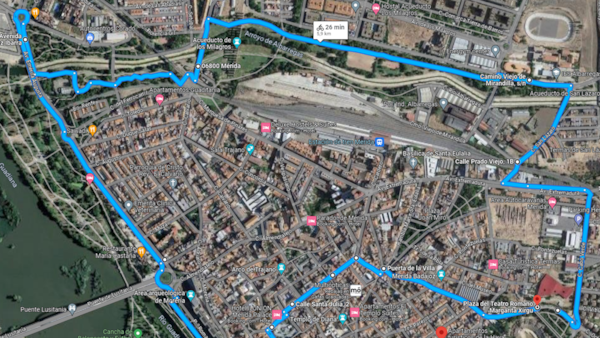 El recorrido, de cinco kilómetros de longitud y para el que es obligatorio el uso de casco, será, desde la Plaza Margarita Xirgú, por la calle Cabo Verde, San Lázaro, Parque de Albarregas, Avenida Emérita Augusta, Avenida José Fernández López, Paseo de Roma, Plaza de España, Calle Félix Valverde Lillo, Puerta de la Villa, José Ramón Mélida y llegada a plaza de Margarita Xirgú.