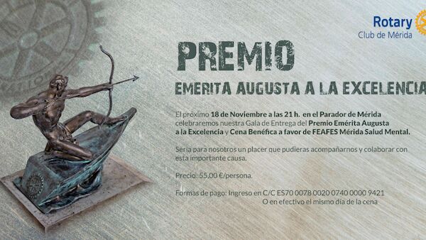 El Club Rotary de Mérida celebrará este sábado, 18 de noviembre, a las 21:00 horas, en el Parador Nacional de Turismo 'Vía de la Plata' de la ciudad, su Gala de Entrega del Premio Emérita Augusta a la Excelencia y Cena Benéfica a favor de FEAFES Mérida Salud Mental.