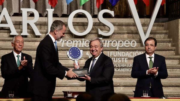 Por último, y en portugués, Felipe VI ha dado la enhorabuena a António Guterres por el Premio Europeo Carlos V, por su carrera profesional y por "su compromiso vital ejemplar al servicio de todos".