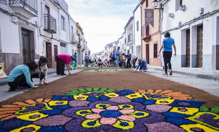 Y es que en la víspera del Día del Corpus los vecinos se echan a la calle para comenzar con el trazado de motivos religiosos, florales o geométricos que, de madrugada, comenzarán a adquirir un colorido singular para convertirse en verdaderas obras de arte efímero.