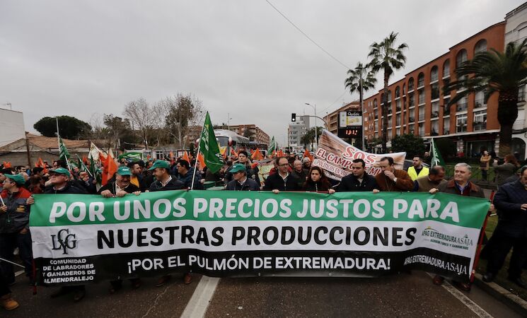 La protesta ha sido convocada por las principales organizaciones agrarias, entre ellas Asaja Extremadura, Apag Extremadura Asaja, UPA-UCE y Coag, que han reunido, según los organizadores, a unos 10.000 agricultores y ganaderos procedentes de toda la comunidad autónoma para reclamar precios justos por sus productos y más control a los "abusos" de los especuladores.