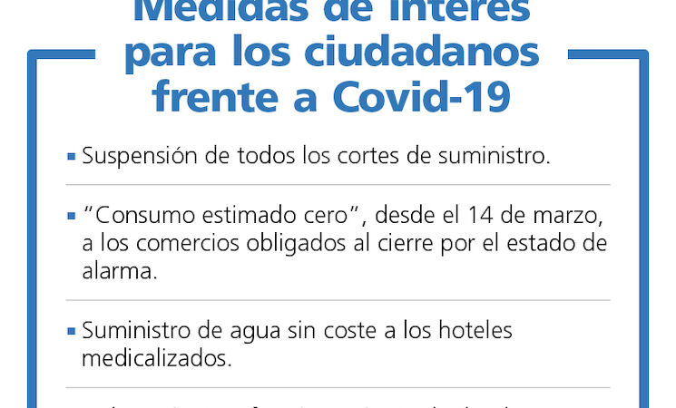 Por otro lado, y para apoyar a los autónomos y otros clientes incluidos dentro de aquellos que tengan prohibida la apertura al público de acuerdo con lo dispuesto en los reales decretos 463 y 465/2020, se aplicará un consumo estimado de cero metros cúbicos al día desde el 14 de marzo a todos aquellos usuarios a los que no se les pueda realizar la lectura real de sus contadores.