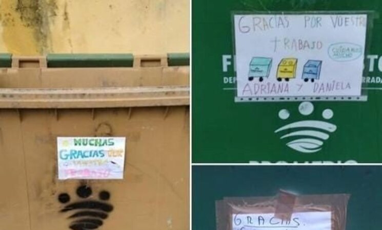 En Campanario, también se han encontrado al menos tres inscripciones en folios adheridos al contenedor agradeciendo la labor: "Vosotros también sois imprescindibles. Ánimo valientes y suerte"; y "Gracias por vuestro trabajo, cuidaros mucho", seguido de un dibujo de los contenedores de las diferentes fracciones verde, amarilla y azul.