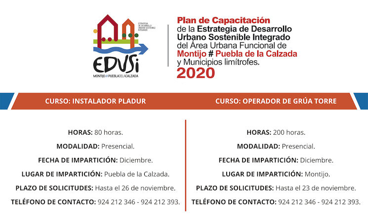 El Plan de capacitación para el empleo y contra la exclusión social de la Estrategia de Desarrollo Urbano Sostenible Integrado recoge una relación de actividades de formación que serán impartidas en el Área Urbana Funcional (AUF) Montijo-Puebla de la Calzada y municipios limítrofes, dentro del Programa Operativo de Crecimiento Sostenible Feder, 2014-2020.