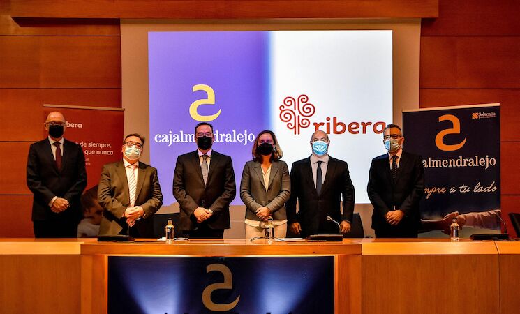El acuerdo ha sido rubricado en la sede institucional de Cajalmendralejo por la consejera delegada del Grupo Ribera, Elisa Tarazona, y por el director general de Cajalmendralejo, Fernando Palacios González.