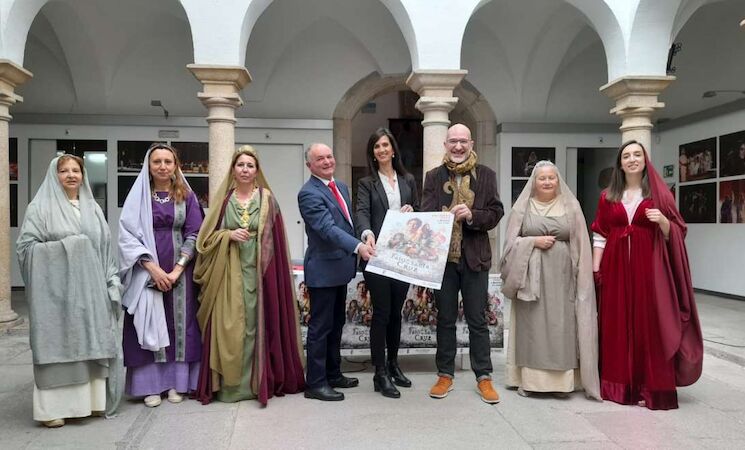 'El Paso de la Santa Cruz' ha sido presentada este miércoles en Mérida por la secretaria general de Cultura de la Junta de Extremadura, Miriam García Cabezas; la diputada de la Diputación de Badajoz Raquel del Puerto; el alcalde de Palomas, Francisco Ginés; el director de la representación, José Antonio Raynoud, y su compositor musical, David Álvarez.