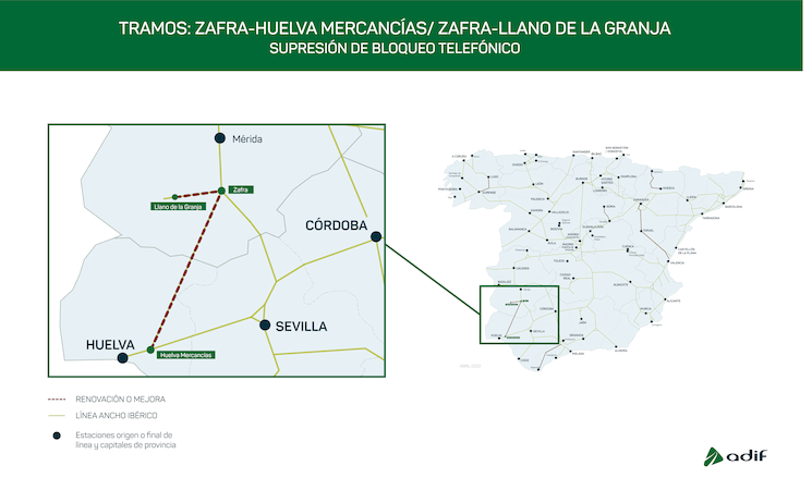 Adif llevará a cabo la supresión de bloqueo telefónico en las líneas Zafra-Huelva Mercancías y Zafra-Llano de la Granja, situadas en las provincias de Badajoz y Huelva, por un importe de más de 44,7 millones de euros.