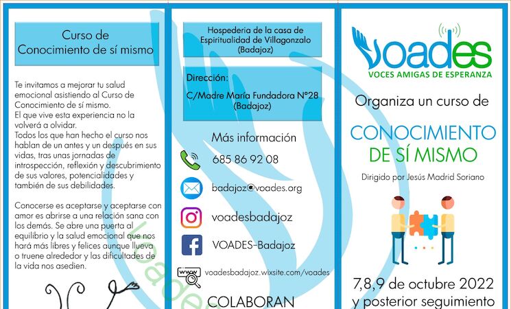 La Asociación Voces Amigas de Esperanza ha organizado un curso de "Conocimiento de sí mismo", dirigido por Jesús Madrid Soriano para los próximos días 7, 8 y 9 de octubre en la Hospedería de la Casa de Espiritualidad de Villagonzalo.