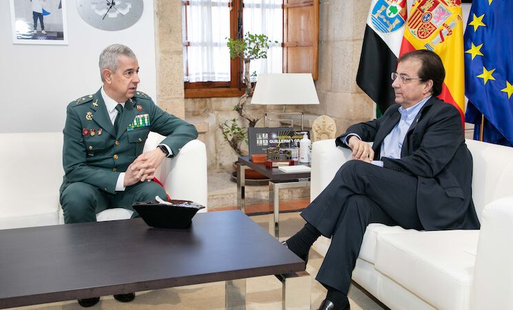 El presidente de la Junta de Extremadura, Guillermo Fernández Vara, se ha reunido este jueves con el nuevo general jefe de Zona de la Comandancia de la Guardia Civil de Badajoz, Carlos Sarrión Resa.