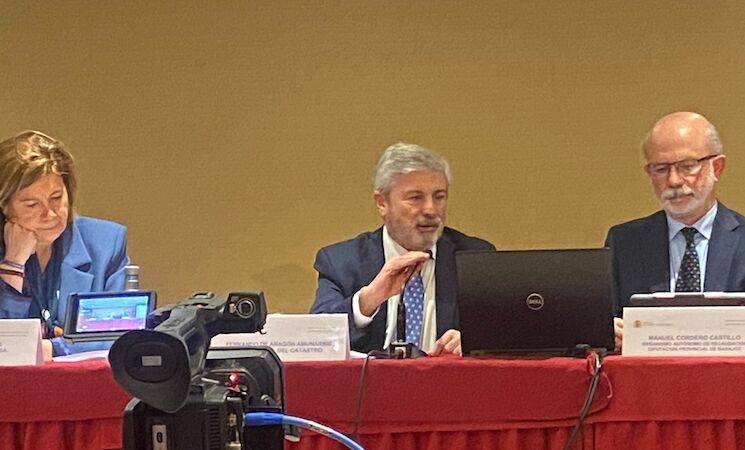 El Gerente del OAR, Manuel Cordero Castillo, participa en las Jornadas de la Dirección General del Catastro, que se celebran los días 14, 15 y 16 de febrero de 2023 en Santiago de Compostela, junto al director general del Catastro, Fernando de Aragón Amunárriz, y la presidenta de SEGIPSA, Inés Bardón Rafael, en la Mesa de Conclusiones.