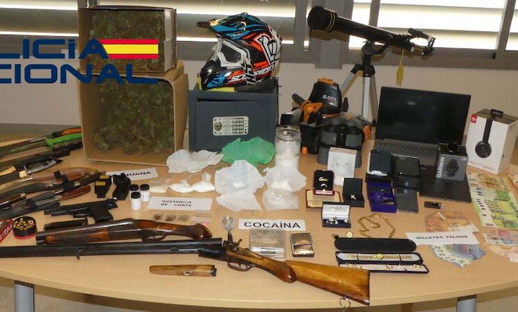 Con todos los indicios y la autorización judicial, la Policía Nacional llevó a cabo el pasado 24 de mayo cuatro registros en los barrios de Santa Ana, San José y en dos casas de campo en la zona 'El Torruco', en los que los agentes se incautaron de 360 gramos de cocaína, 1.900 gramos de marihuana, sustancia de corte, 10.300 euros en billetes fraccionado, una escopeta calibre 12, otra escopeta paralela, una pistola modificada, diferentes armas blancas, munición, joyas y material informático.