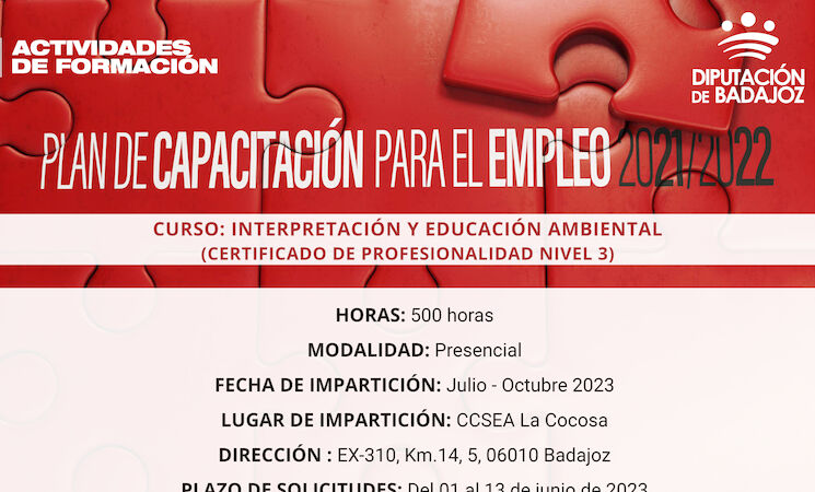 La Diputación de Badajoz ha abierto el plazo de solicitudes para participar en una acción formativa gratuita de interpretación y educación ambiental, con certificado de profesionalidad de nivel 3 (SEAG0109 - homologado por el Sexpe), y que se desarrollará entre los meses de julio y octubre en el Centro de Capacitación en Sostenibilidad y Educación Ambiental 'La Cocosa', situado en el kilómetro 14 de la EX-310 en Badajoz.