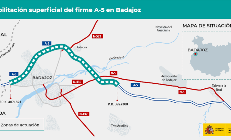 El Ministerio de Transportes, Movilidad y Agenda Urbana (Mitma) ha formalizado por 14,3 millones de euros (IVA incluido) el contrato de obras para la rehabilitación del firme de la autovía del suroeste A-5, entre los kilómetros 392,300 y 407,821, correspondiente al tramo entre Badajoz Este y Badajoz Oeste, en la provincia de Badajoz.