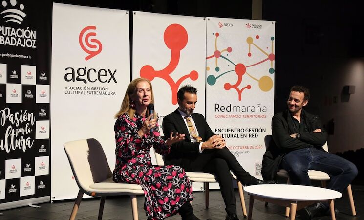 Mientras, Carmen Hernán, junto con Ana Toro, técnica de la AGCEX y coordinadora del proyecto Red Maraña, y Fernando Pascual, miembro de la Junta Directiva de la AGCEX y gestor cultural de la Mancomunidad Integral de Municipios Guadiana, hicieron balance del segundo año de Red Maraña, donde ocho comarcas de la provincia están inmersas en un proceso participativo activo, con la implicación de los agentes culturales con el fin de detectar necesidades reales en el territorio y definir estrategias compartidas que posicionen el desarrollo cultural como medida para la lucha contra la despoblación rural, articulando acciones y proyectos que propongan un modelo de desarrollo que garantice la sostenibilidad de la vida.