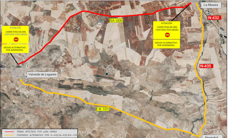La Diputación de Badajoz ha informado que la carretera provincial BA-006, que transcurre de La Albuera a Valverde de Leganés, permanecerá cerrada al tráfico los días laborables desde el 3 de abril al 3 de julio debido a las obras que se realizan en la misma.