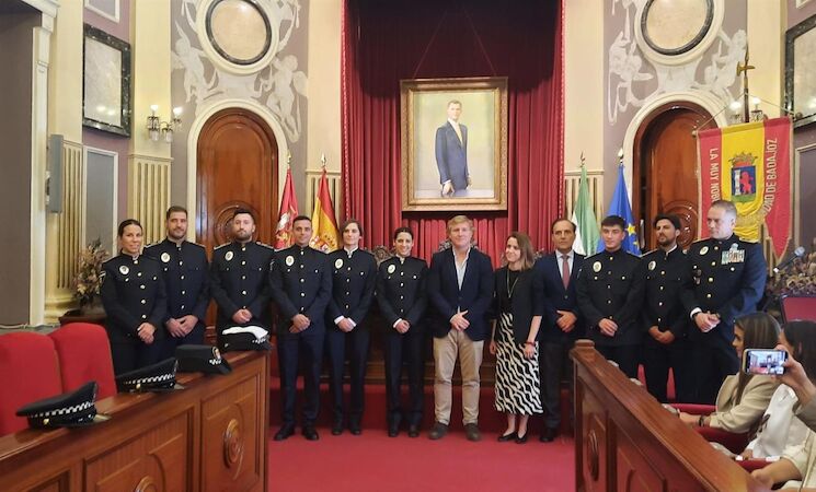 El salón de plenos del ayuntamiento ha albergado este martes el acto de toma de posesión de los nuevos policías locales de Badajoz, un total de ocho que están trabajando en las calles desde el pasado mes de marzo y que este lunes participaron en la entrega de diplomas y orlas a la XXXII Promoción del Curso Selectivo de mandos y Agentes de Policía Local de Extremadura en el Teatro López de Ayala.