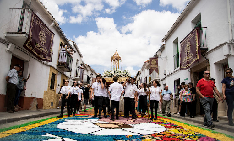 Finalmente, una vez que las alfombras están culminadas, a las 13:00 horas se abrirá la puerta mayor del templo parroquial para que salga la procesión y las calles se abarroten al paso del cortejo.