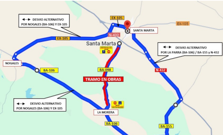 La carretera provincial BA-098, de Santa Marta a La Morera, se mantendrá cerrada al tráfico hasta el próximo 10 de diciembre debido a las obras que se vienen realizando y que "imposibilitan" el paso de vehículos en "adecuadas" condiciones de seguridad.