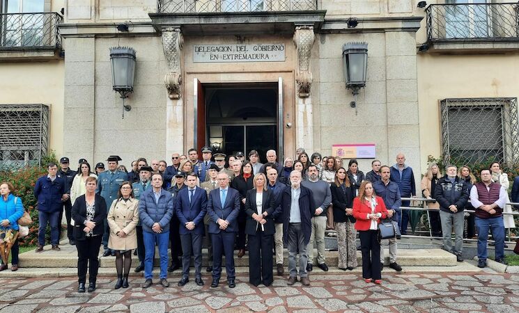 Autoridades o miembros de las Fuerzas y Cuerpos de Seguridad han guardado este jueves un minuto de silencio a las puertas de la Delegación del Gobierno en Extremadura, en Badajoz, en memoria de las víctimas mortales de la DANA tras las lluvias torrenciales que se han registrado en regiones del país como Comunidad Valencia, Castilla-La Mancha y Andalucía, así como para mostrar apoyo y solidaridad con los afectados.