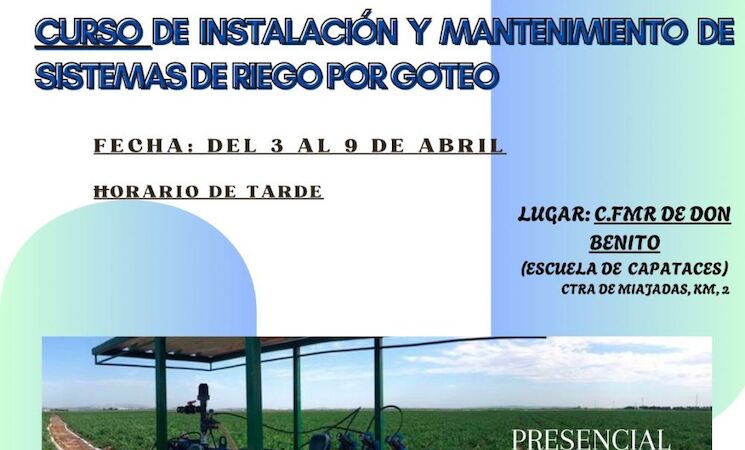El Centro de Formación del Medio Rural (CFMR) de Don Benito ha abierto el plazo de inscripciones del curso especializado en instalación y mantenimiento de sistemas de riego por goteo, donde se expondrán las técnicas más avanzadas para lograr un riego eficiente y ahorrar agua en las superficies cultivadas de Extremadura.