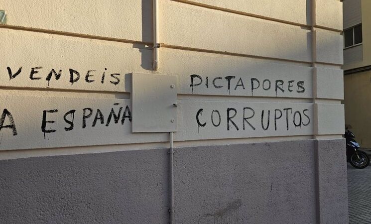 La sede provincial del PSOE en Badajoz ha vuelto a amanecer este lunes, 24 de marzo, con una serie de pintadas en su fachada, en las que puede leerse 'Vendéis a España' o 'Dictadores corruptos'.