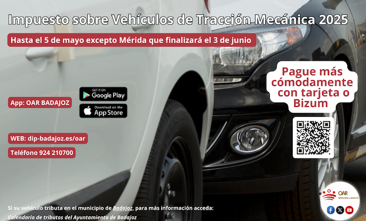 El periodo de pago voluntario del Impuesto sobre Vehículos de Tracción Mecánica finalizará el próximo 5 de mayo en toda la provincia de Badajoz, excepto en la ciudad de Mérida, en la que acabará el 3 de junio, no afectando estas fechas a la capital pacense ni a sus pedanías.
