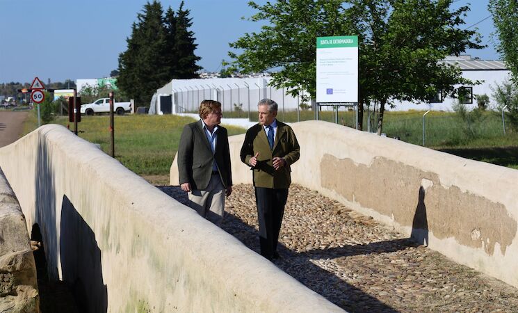 El consejero de Gestión Forestal y Mundo Rural, Ignacio Higuero, junto al alcalde de Badajoz, Ignacio Gragera, ha visitado este jueves la obra de restauración del pozo y del puente sobre el Arroyo Herrerín.