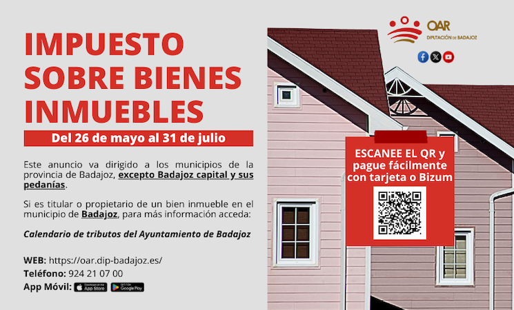 El periodo voluntario de pago del Impuesto sobre Bienes Inmuebles (IBI) está abierto desde este lunes 26 de mayo y finalizará el próximo 31 de julio para toda la provincia de Badajoz excepto la capital pacense y sus pedanías.