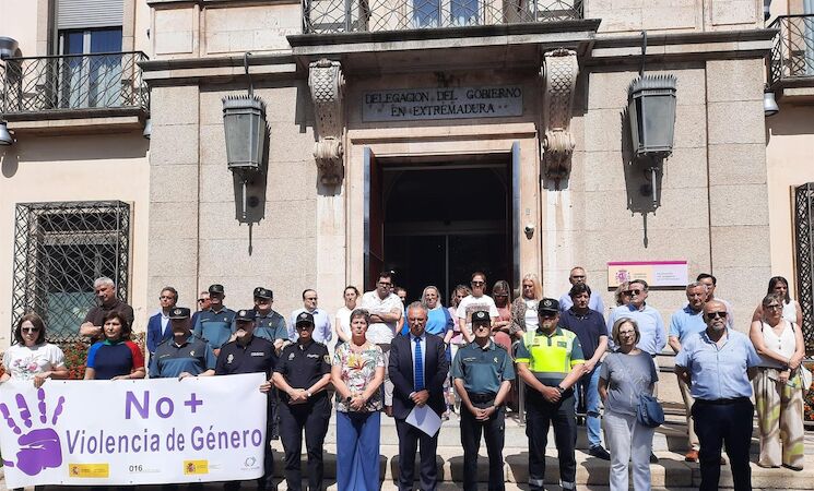 Medio centenar de personas han secundado este jueves, día 29, un minuto de silencio a las puertas de la Delegación del Gobierno en Extremadura, en Badajoz, en memoria de las últimas víctimas de violencia de género.
