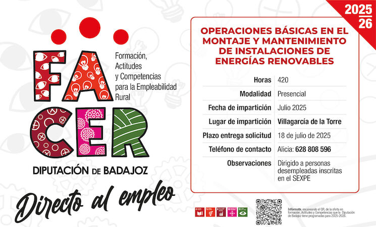 La Diputación de Badajoz, a través del Proyecto Facer (Formación, Actitudes y Competencias para la Empleabilidad Rural), pone en marcha el proceso de recepción de solicitudes para una nueva acción formativa dirigida a mejorar las oportunidades de empleo en el ámbito de las energías renovables.