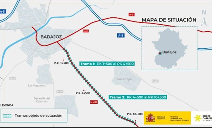 Cabe destacar que esta obras de acondicionamiento, reordenación y mejora del acceso sur de la N-432 al núcleo urbano de Badajoz constan de dos partes diferenciadas, como son por un lado, entre los kilómetros 1 y 4,66, en los que se duplicará la calzada de la carretera, se construirán cuatro glorietas y vías de servicios, y se reordenarán los numerosos accesos existentes.
