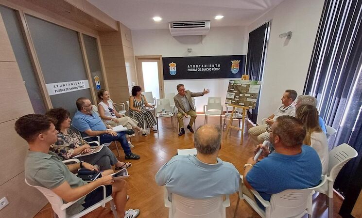 Previamente a la visita a la obra, el secretario general se ha reunido en el ayuntamiento de Puebla de Sancho Pérez con el alcalde de esta localidad y con ediles de Zafra, Medina de las Torres y Valencia del Ventoso, que son las localidades más beneficiadas por esta actuación, a quienes ha explicado los beneficios de esta nueva infraestructura hídrica para la comarca de Zafra - Río Bodión.
