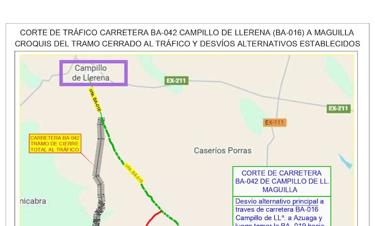 La Diputación de Badajoz ha avanzado que la carretera provincial BA-042, de Campillo de Llerena (BA-016) a Maguilla estará cerrada al tráfico entre los puntos kilométricos 0,000 (intersección con BA-016 de Azuaga a Campillo de Llerena) y el 12,770 (entrada a tramo urbano de Maguilla) debido a las obras que se van a realizar para la mejora del firme en algunos tramos de la misma.