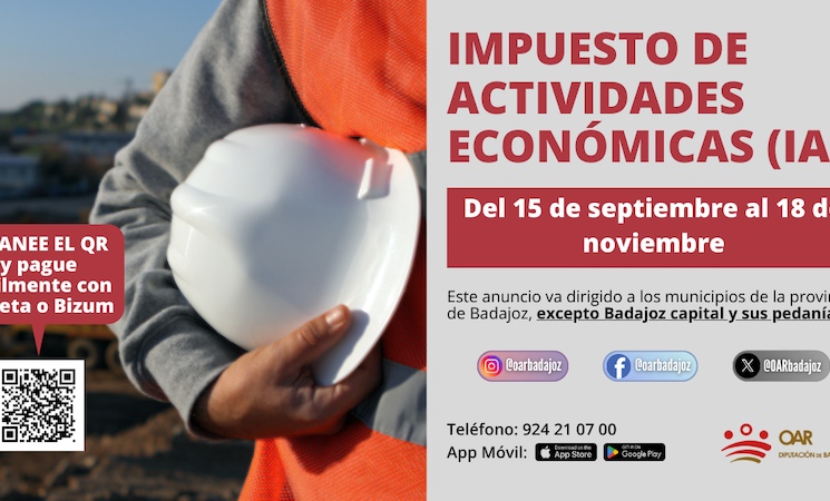 La Diputación de Badajoz recuerda que desde el próximo lunes, 15 de septiembre, está abierto el periodo voluntario de pago de las cuotas municipales del Impuesto sobre Actividades Económicas (IAE) correspondientes al ejercicio 2025, que finalizará el 18 de noviembre.