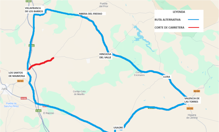 Los desvíos alternativos se llevarán a cabo a través de distintas carreteras, como ha detallado en nota de prensa la Diputación de Badajoz, como en el caso de los usuarios con origen en las poblaciones de Llera, Hinojosa del Valle y destino Los Santos de Maimona, que podrán desviarse alternativamente por la BA-122 (Ribera del Fresno-Hinojosa del Valle) y continuar por Villafranca de los Barros a través de las carreteras EX-342 y N-630.