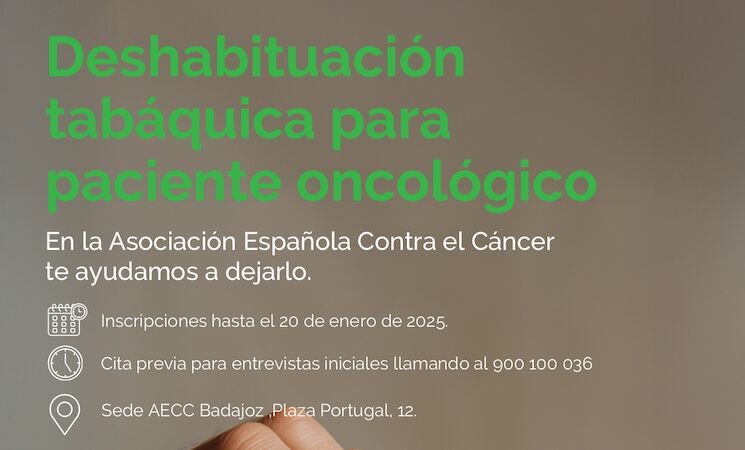 La Asociación Española Contra el Cáncer (AECC) en Badajoz lanza una nueva edición de su curso de deshabituación tabáquica, un programa especializado que tiene como objetivo ayudar a las personas a dejar de fumar y que en esta ocasión está dirigido de manera prioritaria a pacientes oncológicos, mejorando así su calidad de vida y favoreciendo una mejor evolución de la enfermedad.